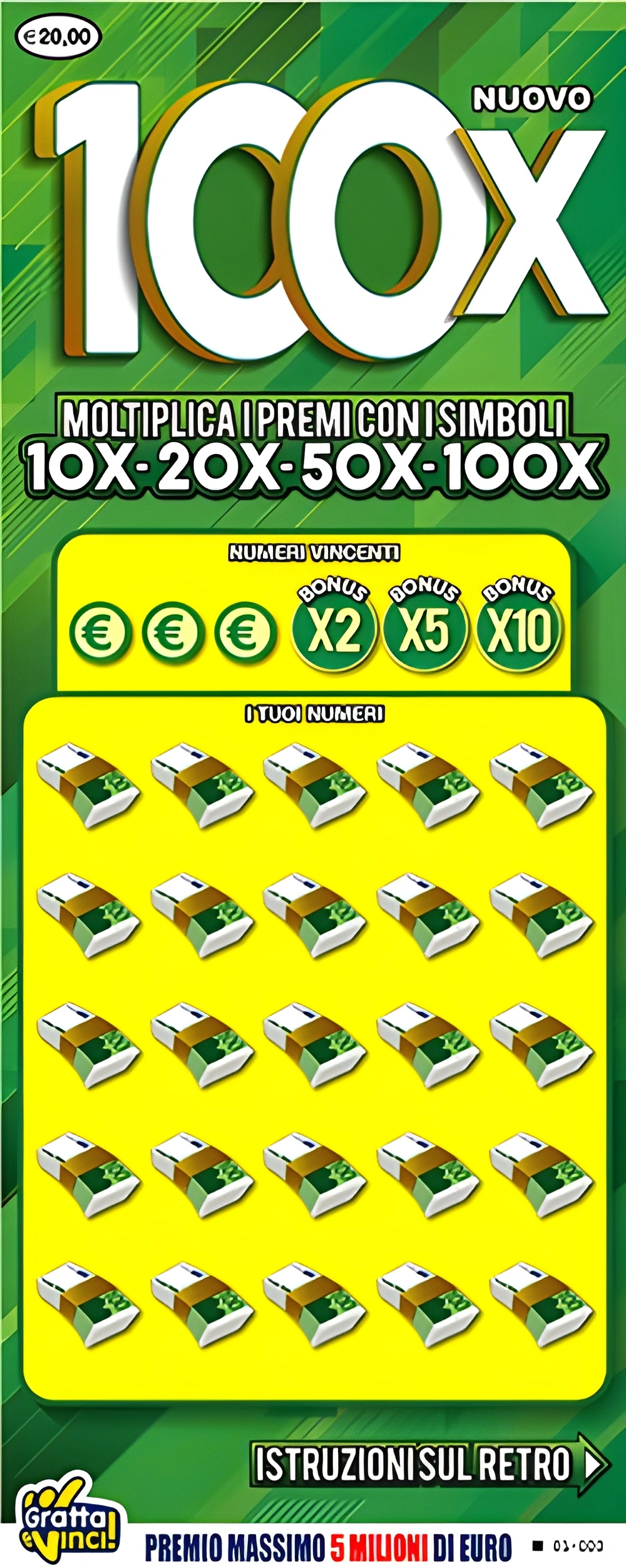 Il gratta e vinci 100X ha un costo di 20 euro ogni biglietto, ed è quindi un gratta e vinci di fascia alta, ma offre un primo premio strabiliante da 5 milioni.